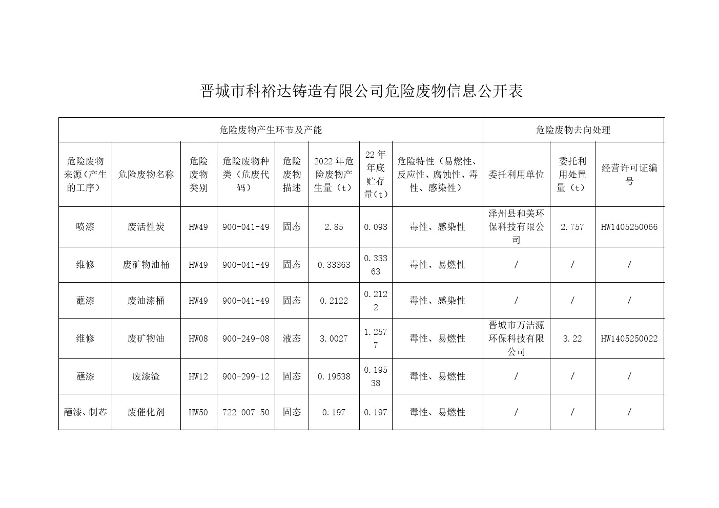 晉城市科裕達(dá)鑄造有限公司危險廢物信息公開表